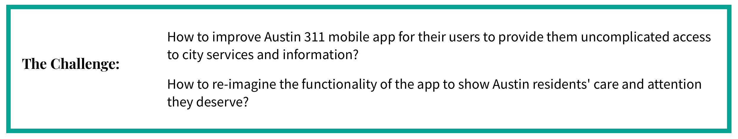 I was working on a project with 3 other designers, and was mostly responsible for the Research, Information Architecture and User Interviews. In addition to those responsibilities, I decided to create my own version of the Austin 3-1-1 user interface. It has always been important for me to go above and beyond and that's how another version of the UI was born.